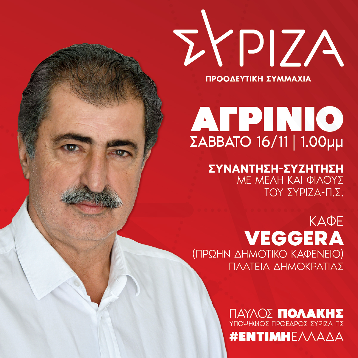 Επιστρέφοντας από την περιοδεία του στα Ιωάννινα, το Σάββατο 16 Νοεμβρίου, ο υποψήφιος Πρόεδρος του ΣΥΡΙΖΑ-Π.Σ. Παύλος Πολάκης θα επισκεφθεί το Αγρίνιο, όπου στις 1.00μμ το μεσημέρι θα συναντηθεί και θα συνομιλήσει με μέλη και φίλους του κόμματος, στο καφέ VEGGERA (πρώην Δημοτικό καφενείο) στην πλατεία Δημοκρατίας στο Αγρίνιο
