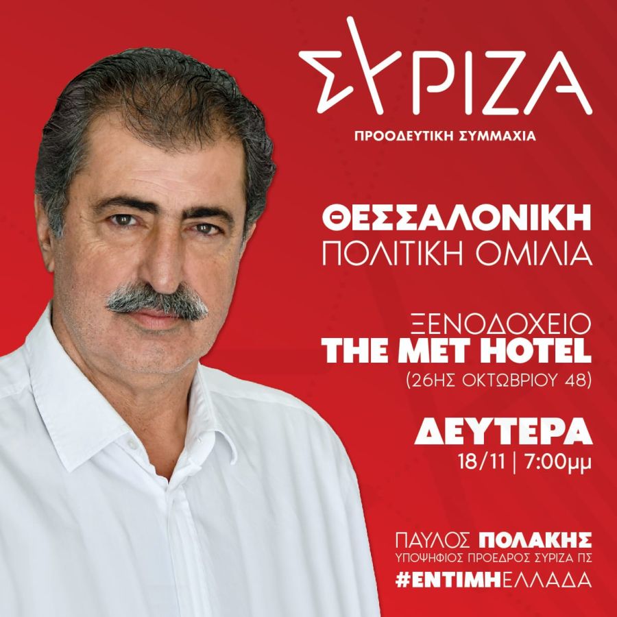 Ο υποψήφιος Πρόεδρος του ΣΥΡΙΖΑ-Π.Σ. Παύλος Πολάκης συνεχίζει τις περιοδείες του σε όλη τη χώρα με επόμενο σταθμό, την Δευτέρα 18 Νοεμβρίου την Θεσσαλονίκη. Συγκεκριμένα, Ο Παύλος Πολάκης θα πραγματοποιήσει συγκέντρωση και ομιλία στο ξενοδοχείο ΤHE MET HOTEL στην οδό 26ης Οκτωβρίου 48, στις 7.00μμ. Καλούνται τα μέλη και οι φίλοι του ΣΥΡΙΖΑ-Π.Σ. από την […]